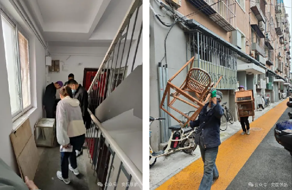 行动前,通过在家属院单元门张贴通知、家属微信群推送提醒等方式,提前告知清理范围与时间,引导居民主动整理个人物品,争取广泛理解与配合。清理过程中,各方分工协作、高效联动:规划建设处统筹协调,制定细致清理方案;医院保安人员冲锋在前,搬运废旧家具、清运堆积杂物;安定门街道花园社区工作人员现场答疑,做好居民沟通工作。